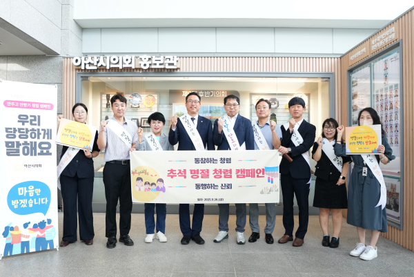 한편, 아산시의회(의장 홍성표)는 26일 추석 명절을 앞두고 의회동 1층 로비에서 청렴캠페인을 실시했다. 홍성표 의장과 의회사무국 직원들은 ‘동참하는 청렴, 동행하는 신뢰’를 주제로 진행된 행사에서 출근길 공직자와 의회를 방문한 시민들에게 ‘청탁금지법’ 관련 홍보자료를 배부하며 청렴 실천 참여를 독려했다.