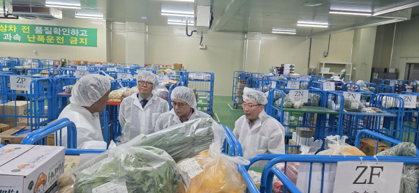 천안시학교급식지원센터에서 교육청 간부들이 현장을 점검하고 있다.