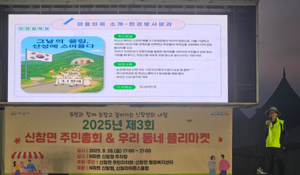 한편, 2026년도 주민자치회에서 추진할 사업 선정에 대한 주민투표는 지난 9월 8일부터 21일까지 온라인 사전투표와 현장 투표를 병행해 실시됐으며, 그 결과 자치계획형 사업 3건(△우리 마을 음악회 △신창건강 백세교실 △다문화 아이들과 함께하는 역사 대탐험)과 민관협력형 사업 3건(△신창면 둘레길 이정표 설치 △벽화와 트릭아트 조성 △신창역 종합 안내판 및 홍보물 제작)이 내년도 신창면 마을사업으로 최종 선정됐다.