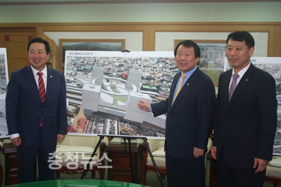 염홍철 대전시장, 이장우 의원, 김광재 한국철도시설공단 이사장 등이 4일 만나 명품 대전역사 신축을 위해 마련된 디자인(안)에 대해 협의에 나섰다.