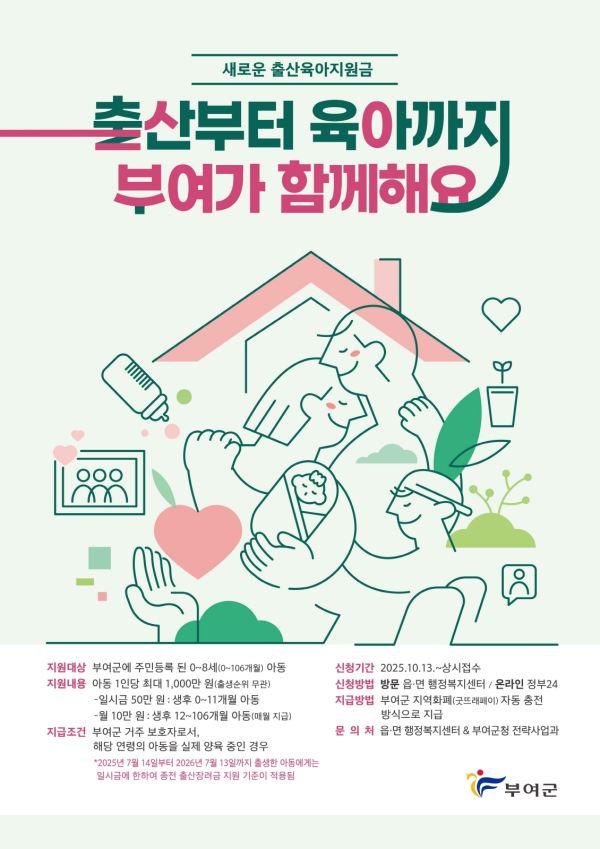 신청은 10월 13일부터 해당 아동의 거주지 읍·면 행정복지센터 방문을 통해 가능하며, 출생 신고 이후라면 언제든지 신청할 수 있다. 지원금은 부여군 지역화폐인 굿뜨래페이로 지급되어 가정의 양육비 부담을 덜어주는 동시에, 지역 내 소비를 촉진하여 골목상권과 지역 상점가 등 소상공인 경제 활성화에도 이바지할 것으로 기대된다.