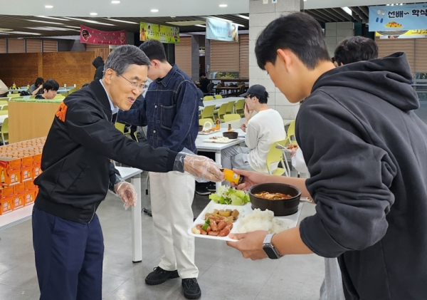 유길상 총장과 총학생회장은 직접 학생식당을 찾아 학생들에게 음료수를 나누어 주며 따뜻한 격려의 메시지를 전달했다.
