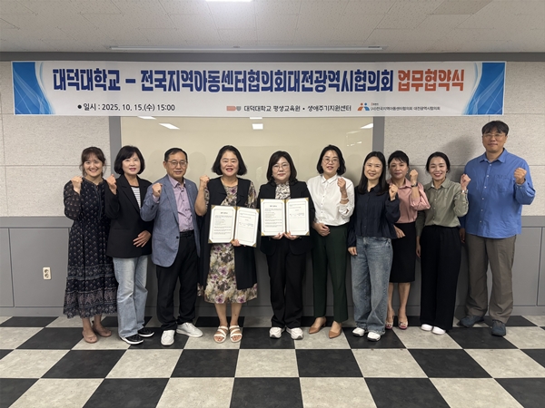 [충청뉴스 이성현 기자] 대덕대학교는 전국지역아동센터협의회 대전시협의회와 지역 아동·청소년의 성장 지원과 종사자 역량강화를 위한 업무협약을 체결했다고 16일 밝혔다.
