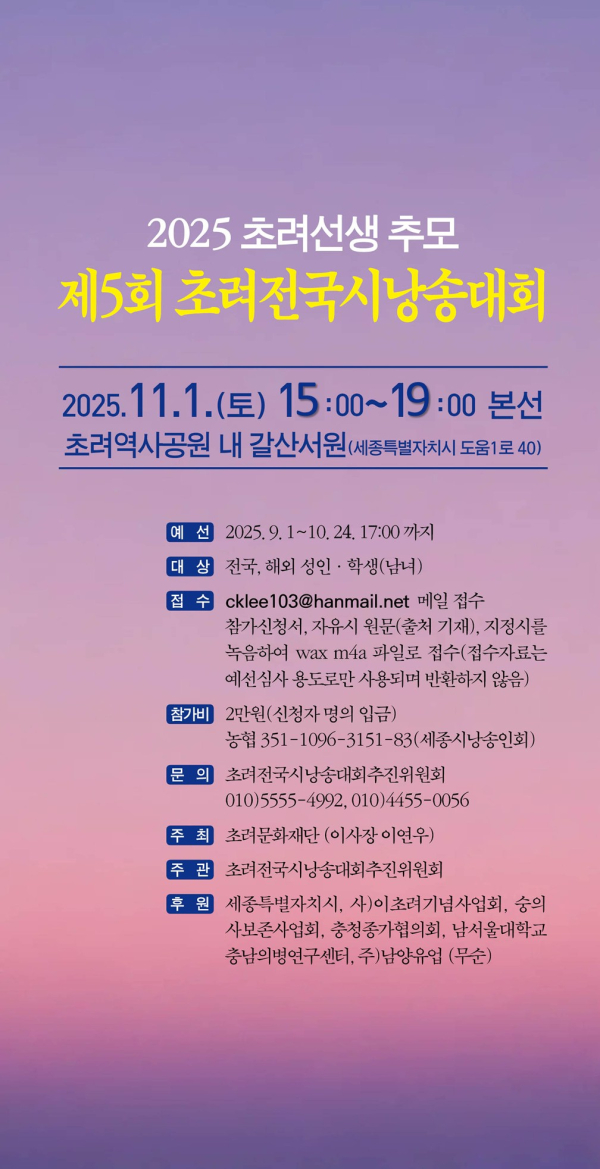 올해로 다섯 번째를 맞는 ‘초려전국시낭송대회’는 충청오현 중 한 분인 초려 이유태 선생(1607~1684)의 학문과 철학을 기리고, 그의 정신을 현대 시로 잇는 전국 규모의 행사다.