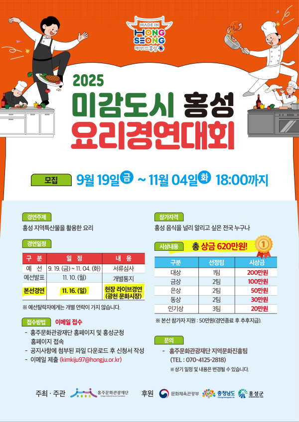 [충청뉴스 박영환 기자] 홍성군은 ‘2025년 미감도시 홍성 요리경연대회’의 참가자를 11월 4일까지 추가 공개 모집한다고 밝혔다.