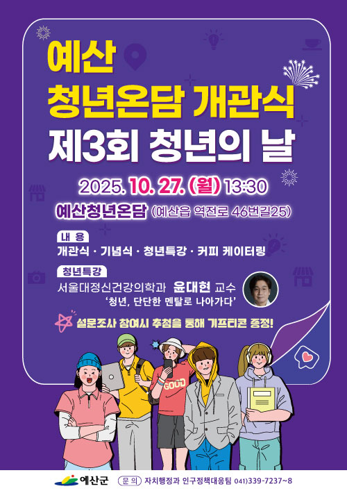 [충청뉴스 박영환 기자] 예산군은 오는 27일 예산읍 주교리에 위치한 청년거점공간 ‘예산청년온담’에서 개관식과 제3회 청년의 날 기념행사를 개최한다고 밝혔다.