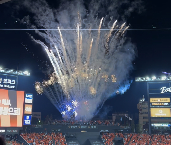 한화이글스가 대전 한화생명볼파크에서 열린 프로야구 플레이오프 최종 5차전에서 삼성을 11-2로 꺾고 한국시리즈 진출을 확정했다. 경기 종료 후 불꽃쇼가 펼쳐지고 있다.