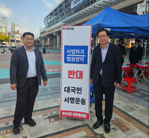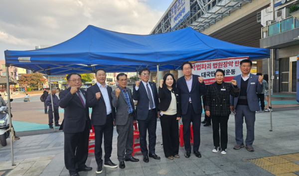 이와같이 여야가 국회에서 민주당의 사법개혁안에 대한 사법파괴 논란이 진행되고 있는 가운데 국민의힘 아산갑 당협에서는 25일 오후 2시부터 온양온천역 입구에서 '사법파괴 법원장악 반대 대국민 서명운동'을 시작했다.