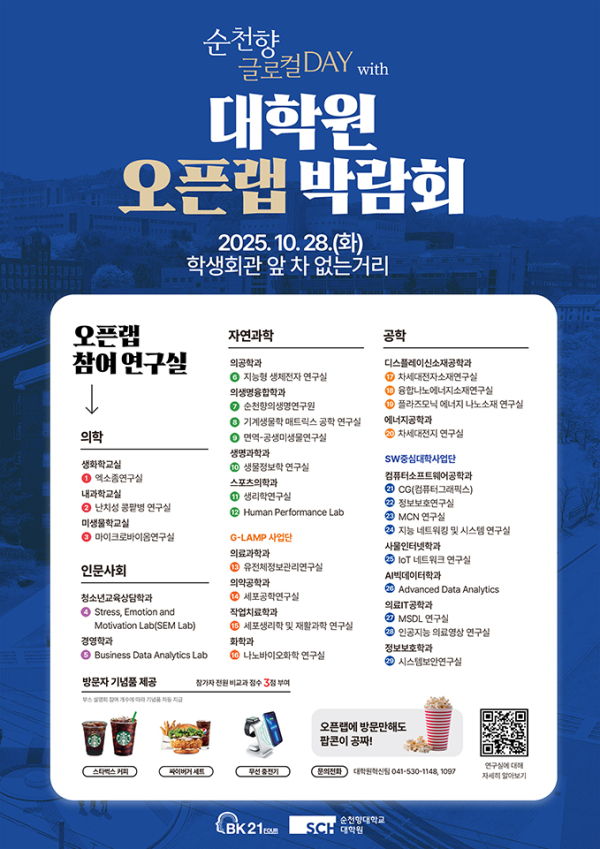 [충청뉴스 유규상 기자] 순천향대(총장 송병국)는 오는 28일 교내 학생회관 앞 차 없는 거리에서 ‘2025학년도 2학기 대학원 오픈랩(OpenLab) 박람회’를 연다.