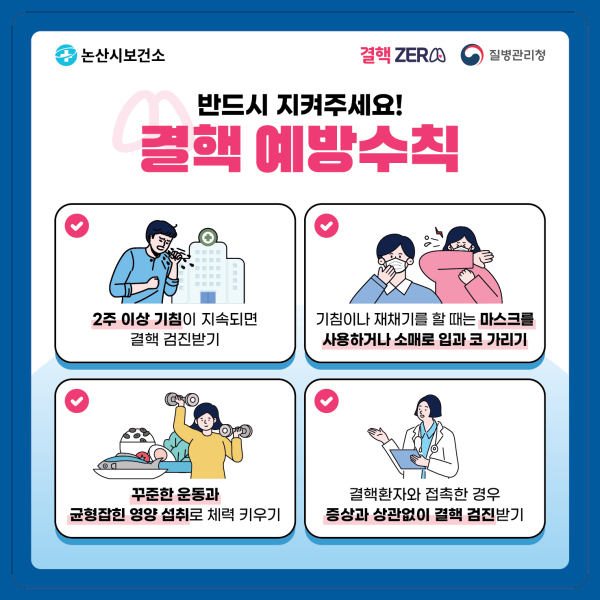 2주 이상 기침, 체중 감소, 발열 등 결핵 주요 증상이 있거나 결핵 환자와 접촉했을 경우 논산시보건소 1층 만성병관리실(041-746-8043)로 문의하면 도움을 받을 수 있다.