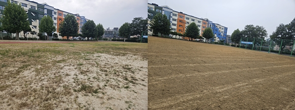 학교 운동장 평탄화 작업 전(왼쪽)과 후 모습.