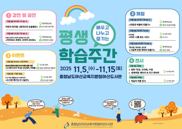 [충청뉴스 유규상 기자] 아산교육지원청 아산도서관(관장 박찬희)은 오는 11월달 ‘평생학습주간’을 맞아‘배우고 나누며 즐기는 평생학습’을 주제로, 지역주민들이 일상속에서 배움의 즐거움을 경험하고 누구나 참여할 수 있는 다채로운 프로그램을 운영한다.