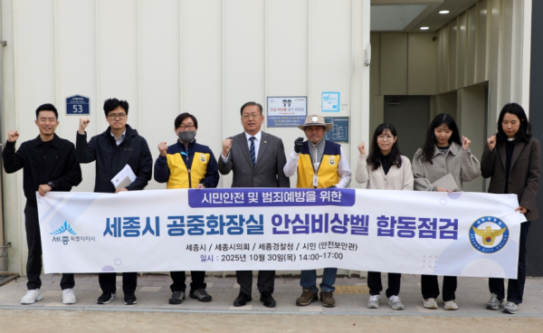 [충청뉴스 최형순 기자] 세종시의회 유인호 의원(더불어민주당, 보람동, 교육안전위원회 소속)은 30일, 민·관·경 유관기관 관계자들과 함께 범죄 취약성이 높은 공중화장실 6개소를 대상으로 안심비상벨 합동점검을 진행하며 시민 안전 증진을 위한 관리체계 개선에 적극 나섰다.