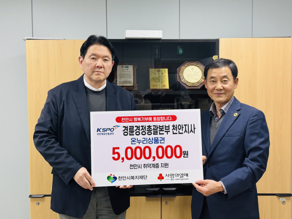 [충청뉴스 유규상 기자] 경륜경정총괄본부 천안지사는 31일 온누리상품권 500만원을 (재)천안시복지재단에 기탁함에 따라 재단은 후원금을 통해 겨울철 난방에 어려움을 겪는 취약계층 주민들에게 난방용품을 지원할 예정이다.