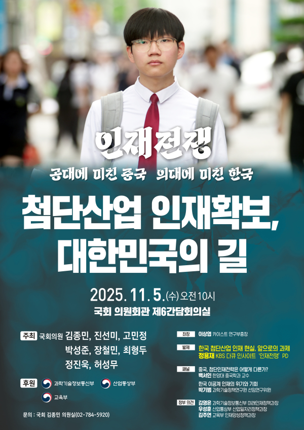 오는 5일 오전 10시, 국회의원회관 제6간담회의실에서 열리는 이번 토론회는 "첨단산업 인재확보, 대한민국의 길"을 주제로, 과학기술정보방송통신위원회, 산업통상자원중소벤처기업위원회, 교육위원회 등 여야 의원들이 공동 주최하며 심도 있는 논의를 진행할 예정이다.