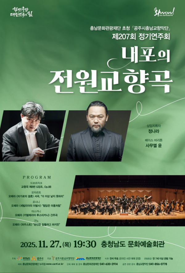 [충청뉴스 박영환 기자] 충남문화관광재단(대표이사 이기진)은 오는 11월 27일 19시 30분, 충남 문화예술회관에서 충남교향악단 제207회 정기연주회 '내포의 전원교향곡' 공연을 개최한다고 밝혔다.