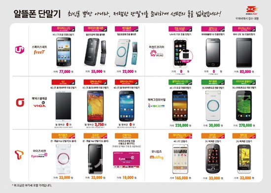 알뜰폰 사업자는 총 6곳으로 스페이스네트, 머천드코리아가 LG텔레콤 U플러스 통신망을, 에넥스텔레콤, 에버그린모바일이 KT올레 통신망을, 아이즈비전, 유티컴즈가 SKT를 통해 서비스를 제공한다. 단말기는 피처폰 8종, 3G 스마트폰 2종, LTE폰 7종으로 총 17종이다. 저렴한 폴더 단말기부터 최신 스마트폰까지 선택할 수 있다.
