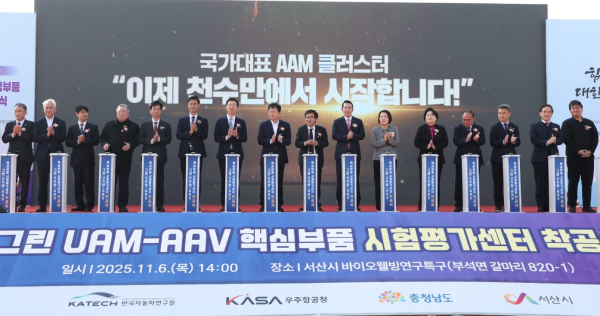 [충청뉴스 박영환 기자] 충남도는 6일 서산시 부석면 갈마리 천수만 B지구 ‘서산 바이오웰빙연구특구’ 내에서 우주항공청·서산시와 ‘그린 도심항공교통(UAM)-미래항공기체(AAV) 핵심부품 시험평가센터(UAM-AAV센터)’ 착공식을 개최했다고 밝혔다.