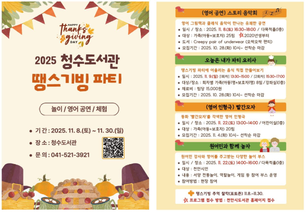 [충청뉴스 유규상 기자] 천안시 청수도서관은 오는 8~ 30일 ‘2025 땡스기빙 파티’를 연다.