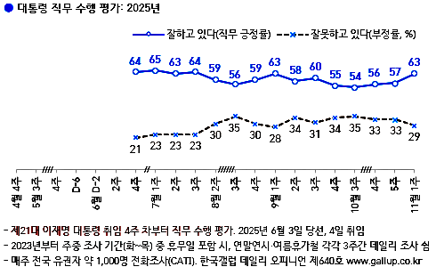 한국갤럽 여론조사 결과 63% 기록... 부정평가는 29%