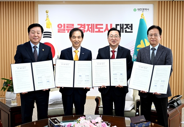 충남대 김정겸 총장과 이장우 대전시장, KAIST 이광형 총장, (사)바이오헬스케어협회 맹필재 회장 등 4개 기관 관계자는 7일 대전시청에서 ‘의과학 융합 인재 양성 및 공동연구를 위한 상호 협력 협약’을 체결했다.