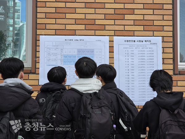 부모님 혹은 친구들과 함께 시험장을 찾은 수험생들은 시험실 배치도와 유의사항 등을 체크했다. 이날 시험장 내부는 개방되지 않았으며 창문에 표기된 시험실 번호와 벽면에 붙은 약도를 통해 위치를 확인했다.