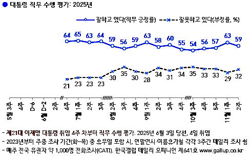 한국갤럽이 지난 11-13일 전국 18세 이상 1003명을 대상으로 실시한 여론조사 결과, 이재명 대통령의 국정 지지율은 일주일 새 4%p 하락해 59%를 기록했다.