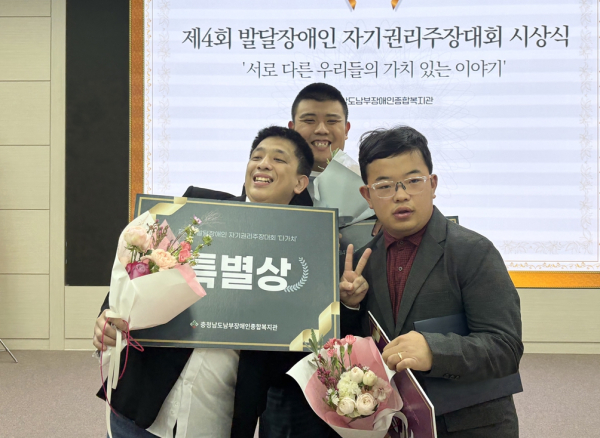 [충청뉴스 최형순 기자] 천안시누리별장애인종합복지관(관장 김경준)의 낮활동 프로그램인 ‘다누리고’ 이용인 3명이 최근 충남 남부장애인종합복지관에서 개최된 제4회 ‘서로 다른 우리들의 가치 있는 이야기’ 자기권리주장대회에 참가하여 참가자 전원 수상이라는 괄목할 만한 성과를 거두었다.