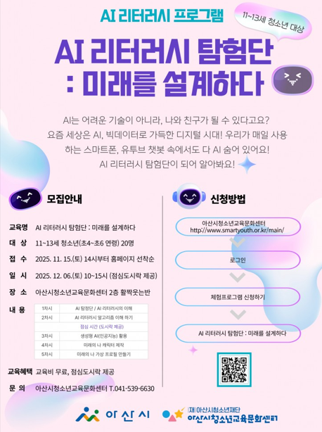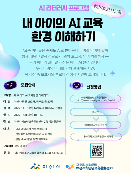 [충청뉴스 유규상 기자] (재)아산시청소년재단 아산시청소년교육문화센터(이하 센터)는 오는 12월 6일 급격히 변화하는 디지털 환경 속에서 청소년의 미래 역량을 강화하고 보호자의 이해를 높이기 위한 「청소년과 보호자를 위한 AI 리터러시 진로 프로그램」을 운영한다.