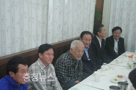 ▲ 민주당 김한길 대표와 이상민 시당위원장 강래구(동구) 이서령(중구) 박영순 (대덕구) 위원장이 조찬하고 있다