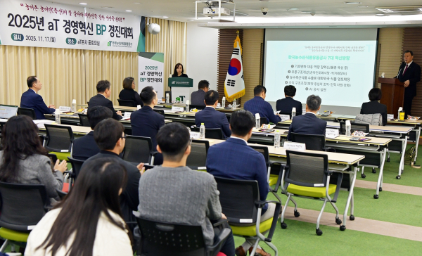 [충청뉴스 최형순 기자] 한국농수산식품유통공사(aT, 사장 홍문표)는 17일 나주 본사에서 ‘2025년 경영혁신 BP(Best Practice) 경진대회’를 성공적으로 개최하고, 국민 삶의 질 향상과 국정과제 이행에 기여한 우수 성과들을 공유하는 자리를 마련했다.