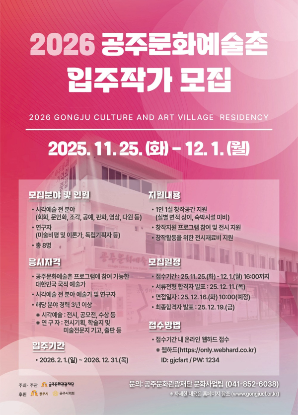 [충청뉴스 공주 = 조홍기 기자] (재)공주문화관광재단이 운영하는 공주문화예술촌이 2026년도 레지던시 입주작가 10기를 모집한다.