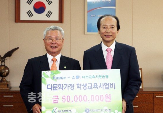 대전시교육청(교육감 김신호)은 11일 오전 시교육청 교육감실에서 (주)금성백조주택(회장 정성욱)로부터 다문화가정 학생 교육사업비 5천만원을 기탁받았다.