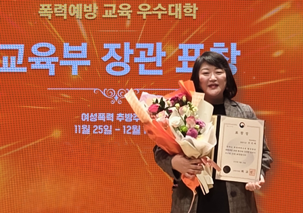 진선애 상담사는 ‘2025 성평등가족부 여성폭력추방주간 기념식’에서 대학내 인권·성평등 문화 확산과 구성원 보호체계 강화에 기여한 공로로 인정받았다.