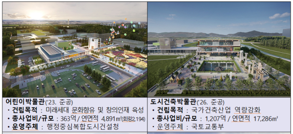 국내·외 건축 문화활동의 허브로서 도시‧건축에 대한 자료 수집 및 전시를 통해 연구거점 기능을 수행할 국립도시건축박물관은 2024년 1월 착공하였으며, 2026년 7월 준공 및 2027년 상반기 개관을 목표로 추진하고 있다.
