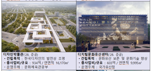 우리나라 고유의 디자인을 전시·보관하는 국립디자인박물관과 다양한 디지털 기술·자원과 문화유산을 접목하여 활용하는 국립디지털문화유산센터는 실시설계 마무리 단계에 있으며, 2026년 실시설계 기술제안 입찰을 통해 시공사를 선정하고 2028년 하반기 개관을 목표로 추진할 예정이다.