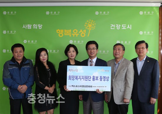 대전시 유성구는 18일 구청 행복사랑방에서 허태정 유성구청장(오른쪽 3번째)과 김정옥 엑스포스타영상문화원 이사장(오른쪽 4번째), 양정찬 사무총장(오른쪽 2번째) 등이 참석한 가운데 희망복지지원단 홍보 동영상 CD 전달식을 가졌다.