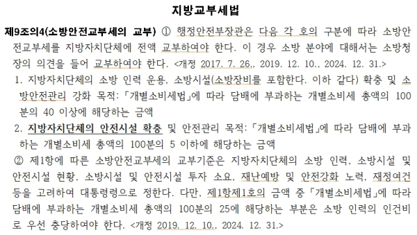 「지방교부세법」 제9조의4 및 동법 시행령 제10조의4에는 소방안전교부세를 사용할 수 있는 대상 사업이 명확히 정해져 있다.