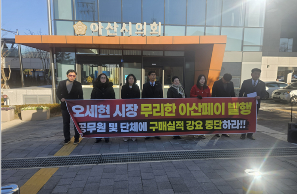 [충청뉴스 유규상 기자] 아산시의회 국민의힘 소속 시의원들(원내 대표 홍순철)은 5일 오전 아산시 의회동 앞에서 기자회견을 갖고 오세현 아산시장이 아산페이 집행관련 공무원 및 단체에게 구매실적을 강요하는 행위의 즉시 중단을 촉구했다.