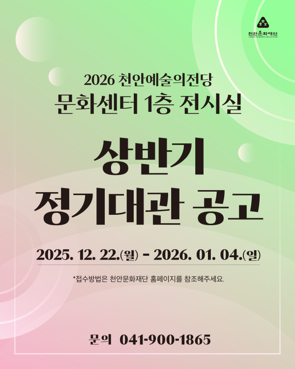 [충청뉴스 유규상 기자] (재)천안문화재단은 오는 22일부터 천안예술의전당 문화센터 전시실 내년 상반기 정기대관을 공모한다.