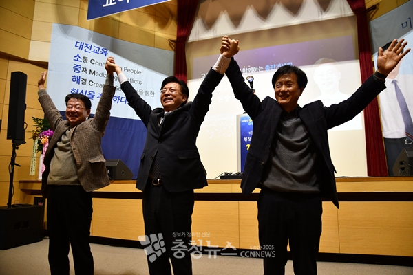 진보교육감 후보로 분류되는 (왼쪽부터) 김한수 전 배재대 부총장, 맹수석 명예교수, 성광진 대전교육연구소장이 손을 잡고 내빈에 인사하고 있다.