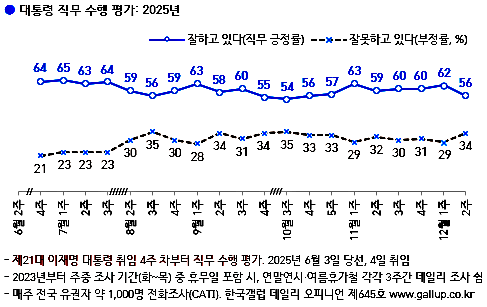 56% ‘잘하고 있다’ 응답... '잘못하고 있다'는 34% 기록