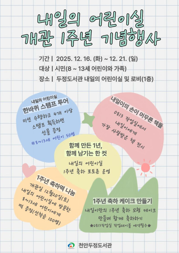 [충청뉴스 유규상 기자] 천안시 두정도서관은 오는 16~ 21일 ‘내일의 어린이실’ 개관 1주년 맞아 다채로운 기념행사를 운영한다.