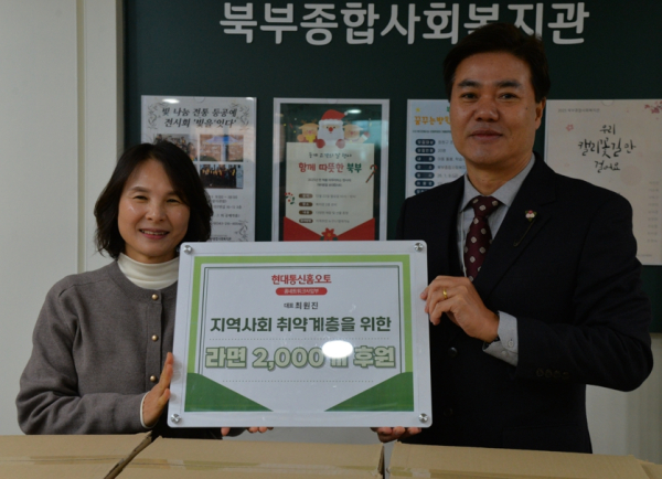 [충청뉴스 최형순 기자] 현대통신홈오토(대표 최원진)는 지난 19일 청주 북부종합사회복지관(관장 허성희)에 라면 2,000개를 후원했다.