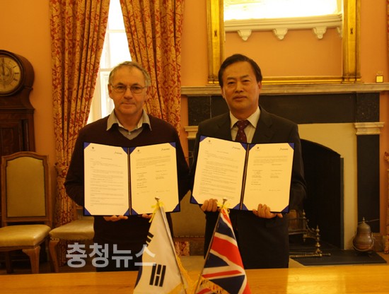 전찬환 충남교육감 권한대행(사진 왼쪽에서 다섯번째) 지난 30일 12시(현지시간)에 2013 세계 대학평가 17위 영국 에든버러대학를 방문해 영어수업전문가 양성을 위한 영어교사 수업실습 연수 MOU를 체결했다.