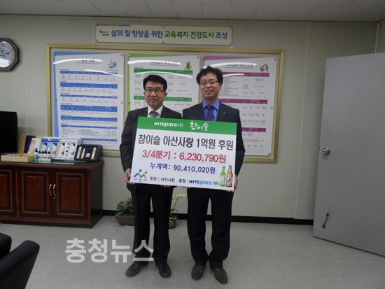 하이트진로(주)는(천안지점장 이계학) 31일 오전 아산시 김용배 교육복지국장을 방문, ‘참이슬 아산사랑 1억원 후원’ 3분기 적립후원금 6백2십3만원을 전달했다.