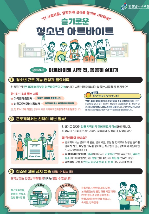 [충청뉴스 박영환 기자] 충남교육청은 학기 말 방학을 앞두고 아르바이트 학생의 증가가 예상됨에 따라 일하는 청소년의 권리 보호를 위한 ‘슬기로운 청소년 아르바이트’ 교육자료를 개발·보급했다고 22일 밝혔다.
