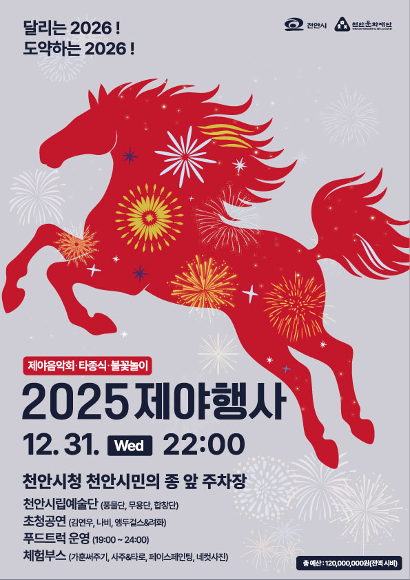시는 8년 만에 시민들의 품으로 돌아온 천안시민의 종과 함께 ‘달리는 2026! 도약하는 2026! 2025 제야행사’를 진행한다. 오후 7시 지역예술인들의 공연을 시작으로 제야음악회와 타종식, 불꽃놀이가 진행된다.