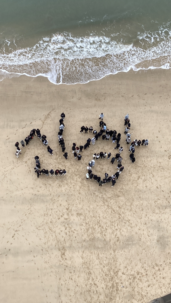 바닷가에서 신창중학교를 표시하는 집단 포퍼먼스를 진행하고 있다.