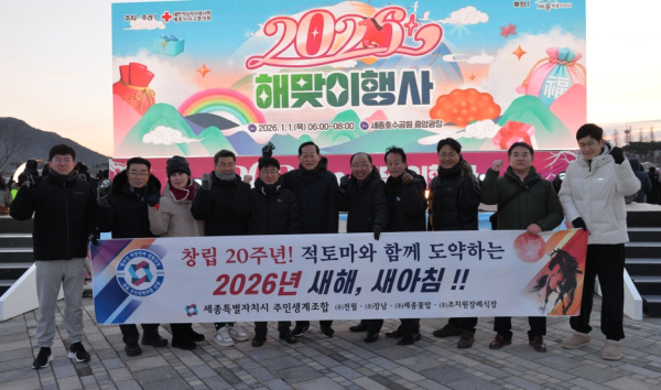[충청뉴스 최형순 기자] 2026년 병오년(丙午年) 새해 첫날, 세종호수공원에서 열린 대규모 해맞이 행사에 이은영 주민생계조합 조합장이 직원들과 함께 참석해 세종 시민의 안녕과 시의 발전을 기원했다.